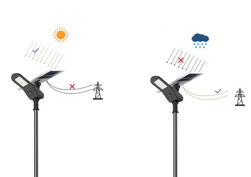 Hybrid solar street lights are the most reliable way to keep whole night lighting ( even at 100% brightness, without dimming) at 365 days, which means it will never turn off at night even at continuous rainy days. Grid-tied solar light systems feed power from the solar panels to the grid during the day, then use the grid power at night.